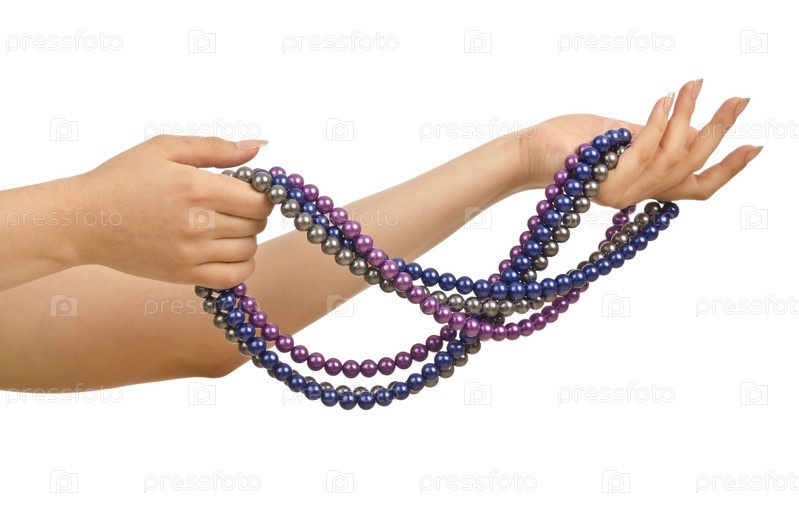 Жемчужное ожерелье в руках на белом фоне