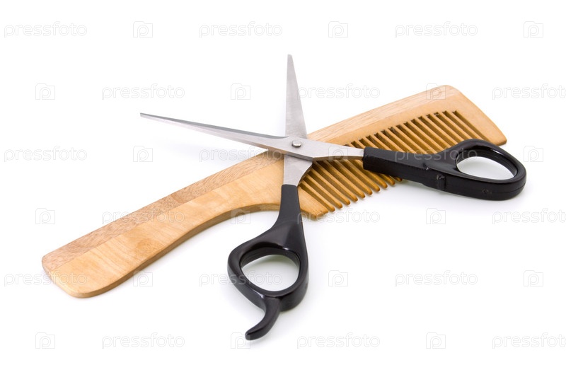 Деревянная расческа и ножницы на белом фоне