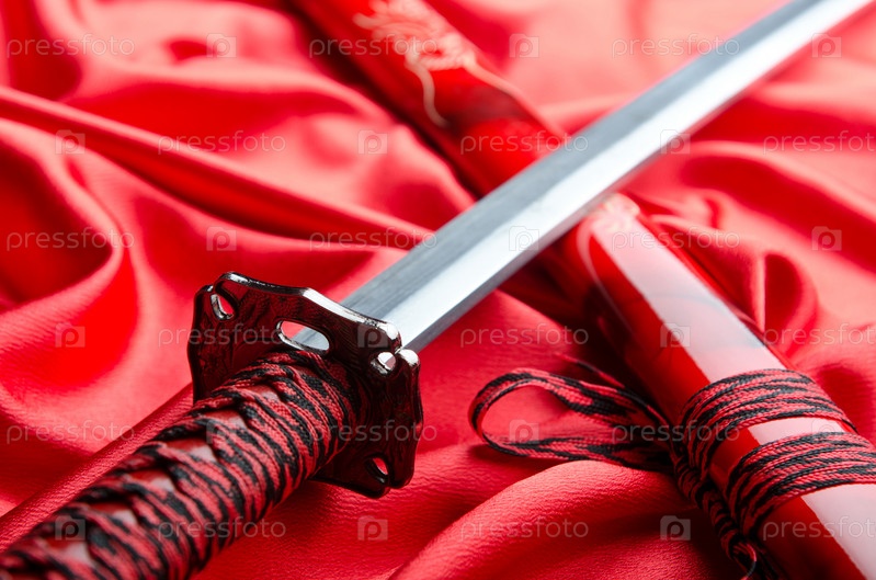Такана, японский меч, на красном атласе