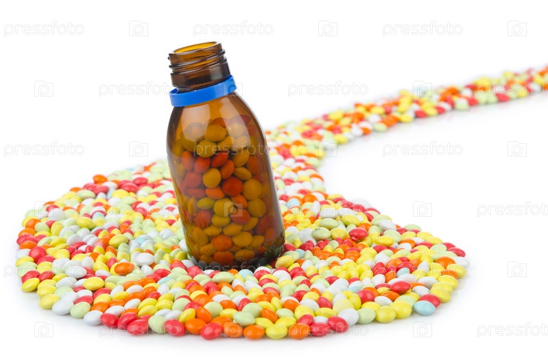 Бутылка с множеством разноцветных таблеток