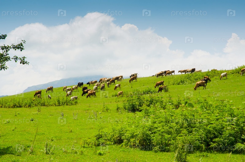 Коровы, пасущиеся на зеленом поле