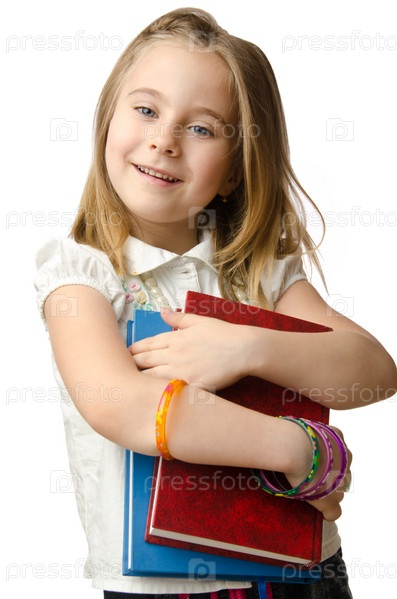 Маленькая девочка с книгами на белом фоне