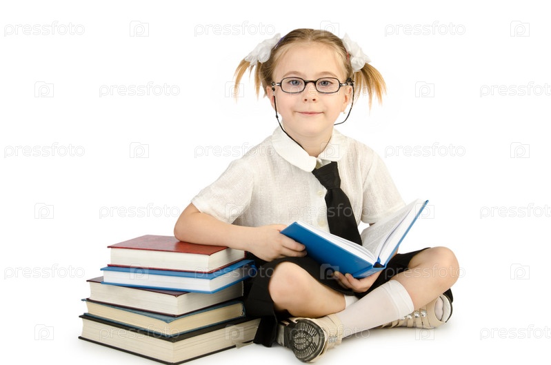 Маленькая девочка с книгами на белом фоне