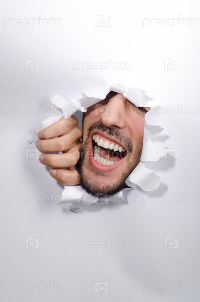 Мужское лицо в отверстии в бумаге