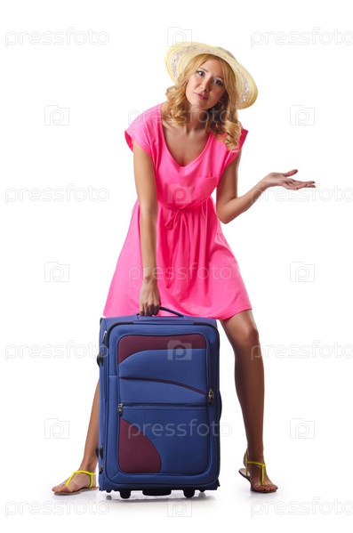 Красивая женщина с чемоданом на белом фоне