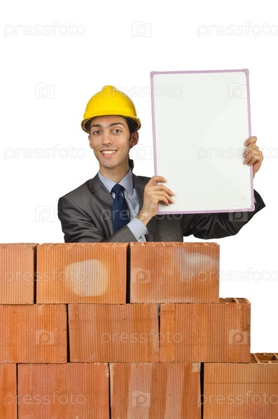 Бизнесмен с кирпичами на белом фоне