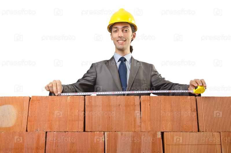 Бизнесмен с кирпичами на белом фоне