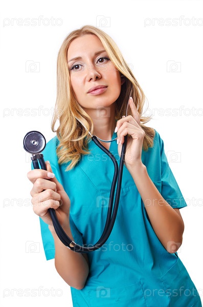Привлекательная женщина-врач, изолированная на белом фоне