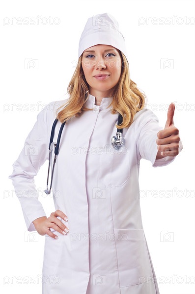 Привлекательная женщина-врач, изолированная на белом фоне