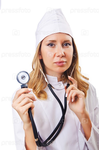 Привлекательная женщина-врач, изолированная на белом фоне