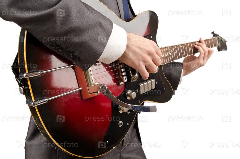 Гитарист в деловом костюме на белом фоне
