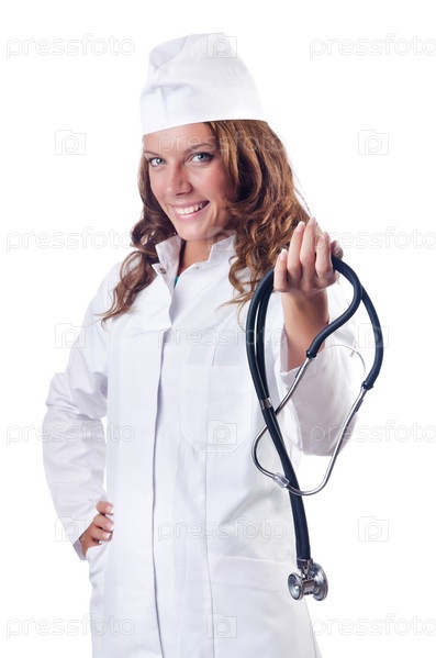 Привлекательная женщина-врач, изолированная на белом фоне