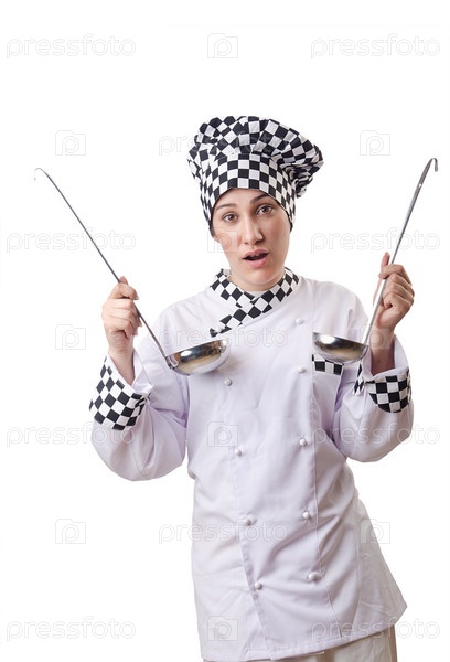 Женщина-повар с черпаками на белом фоне