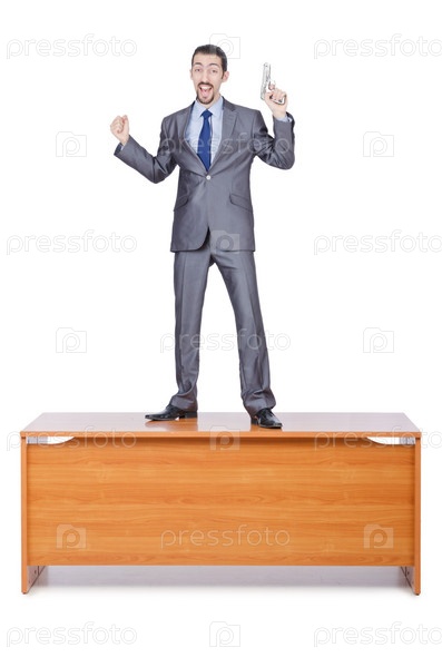 Бизнесмен с оружием на белом фоне