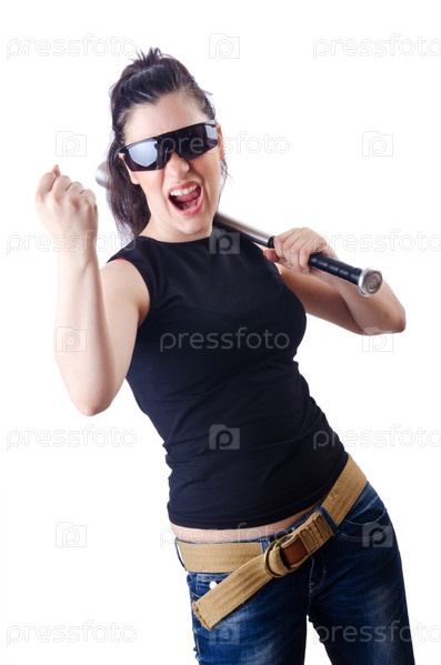Преступница с битой на белом фоне