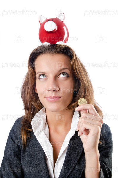 Женщина с копилкой на белом фоне