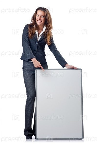 Бизнес-леди с пустым баннером на белом фоне