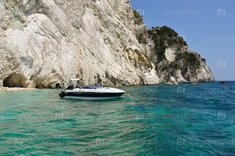 Моторная лодка на якоре на пляже