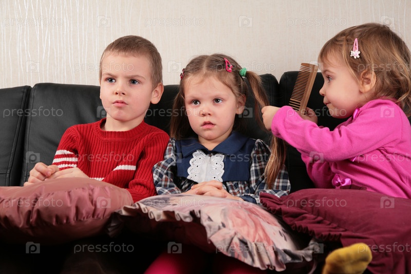 Трое детей на диване, смотрят телевизор