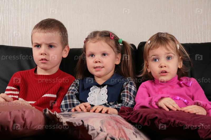 Трое детей на диване, смотрят телевизор