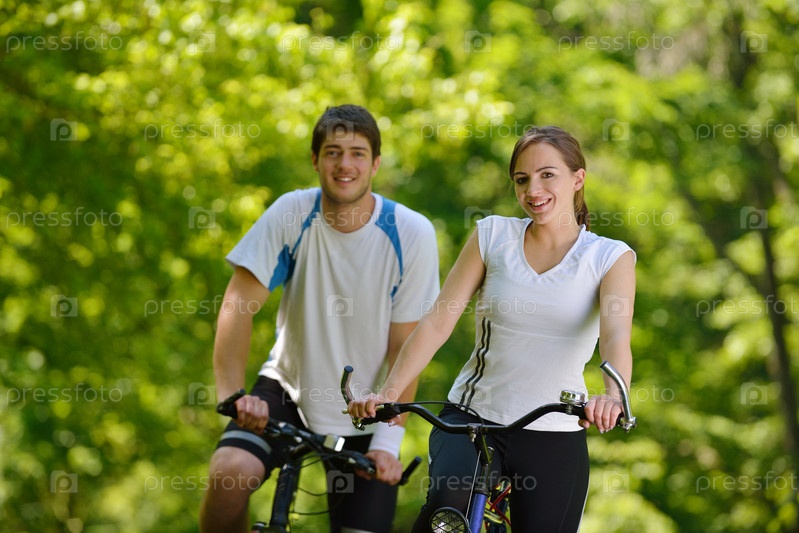 Счастливая пара катается на велосипедах на свежем воздухе