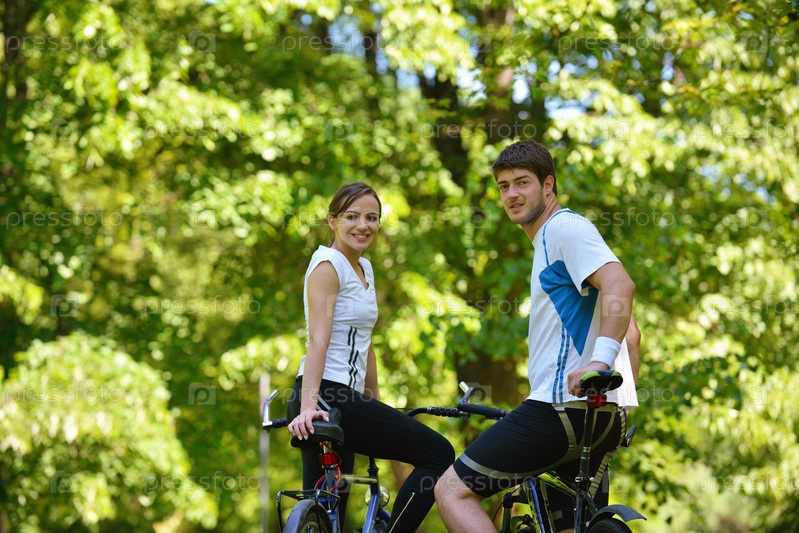 Счастливая пара катается на велосипедах на свежем воздухе