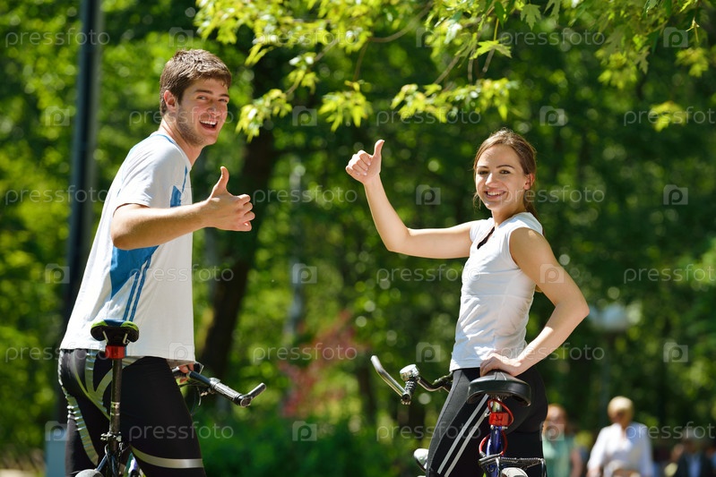 Счастливая пара катается на велосипедах на свежем воздухе