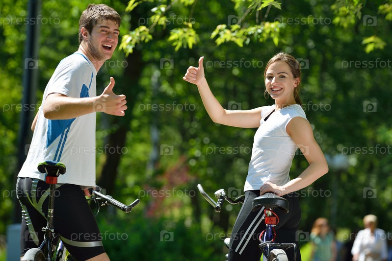 Счастливая пара катается на велосипедах на свежем воздухе