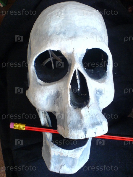 Череп с карандашом в зубах, на черном фоне