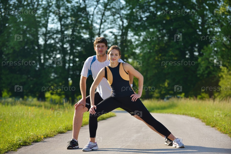 Пара делает растяжку после пробежки