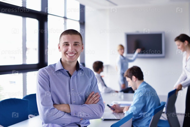 Деловой мужчина на встрече, коллеги на заднем плане