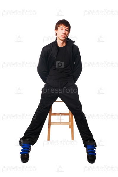 Молодой человек сидит на стуле на белом фоне