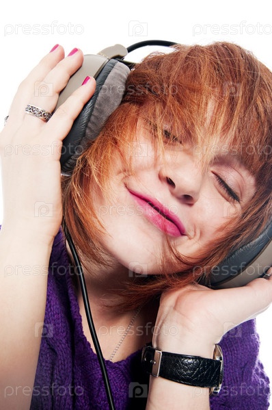 Красивая девушка в наушниках слушает музыку