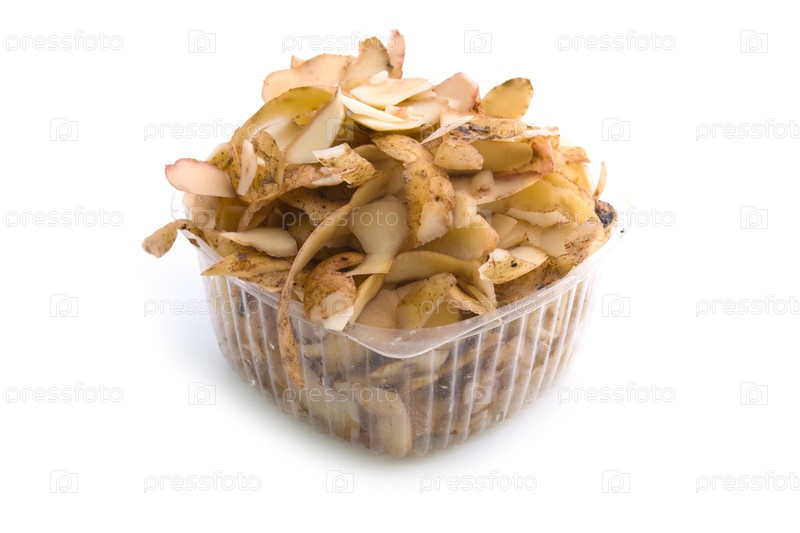 Шкурки картофеля в упаковке, на белом