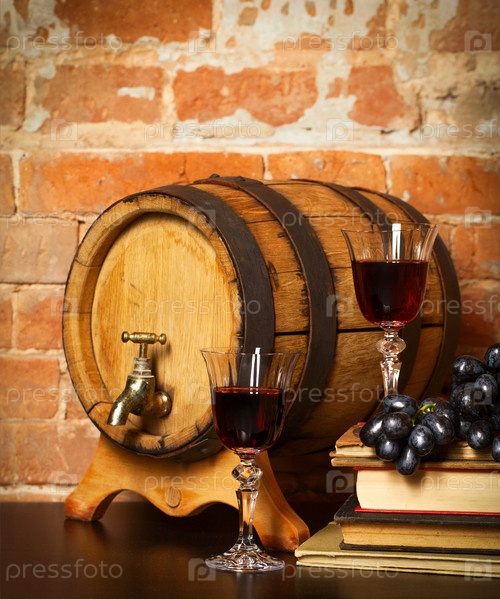 Ретро-натюрморт с красным вином и бочкой