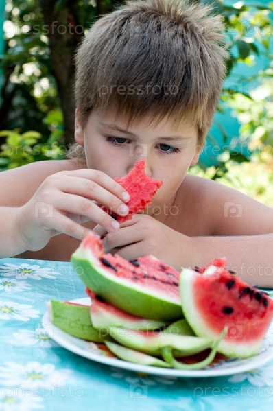 Мальчик ест спелый арбуз