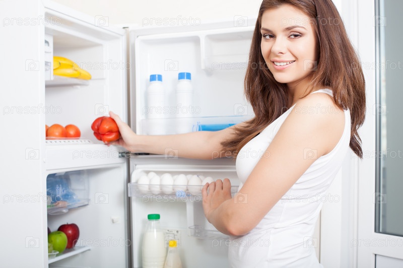 Женщина вынимает перец из холодильника