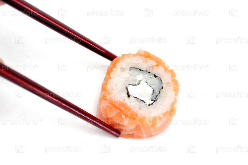 Суши в палочках, изолированные на белом фоне