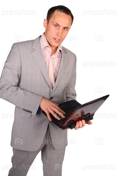 Бизнесмен в сером костюме с ноутбуком на белом фоне