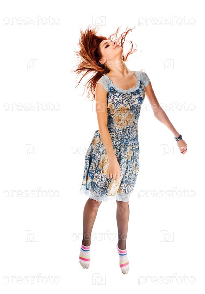 Рыжая девушка в танце на белом фоне