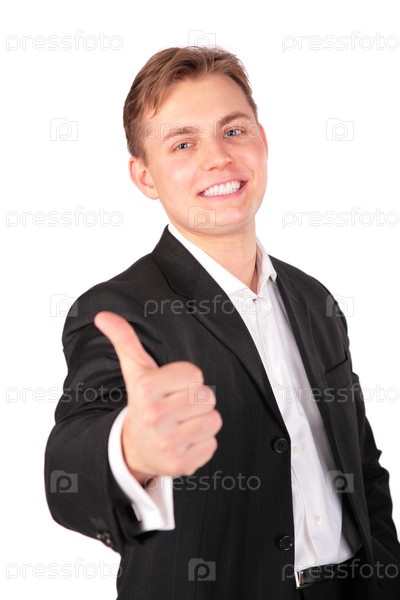 Молодой человек в костюме показывает жест