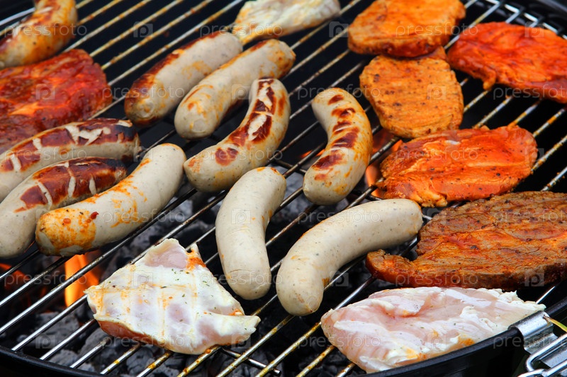 Мясо и колбаса на решетке гриля