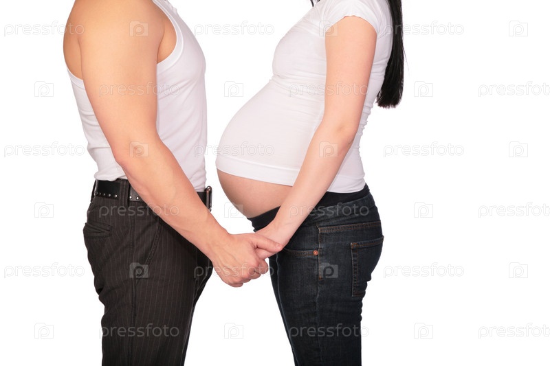 Мужчина и беременная женщина держатся за руки на белом фоне