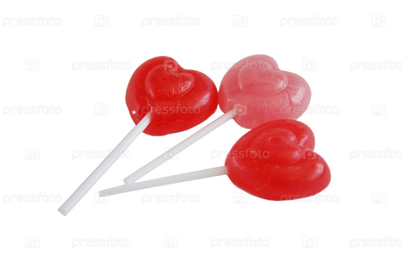 Красные леденцы в форме сердец на белом фоне