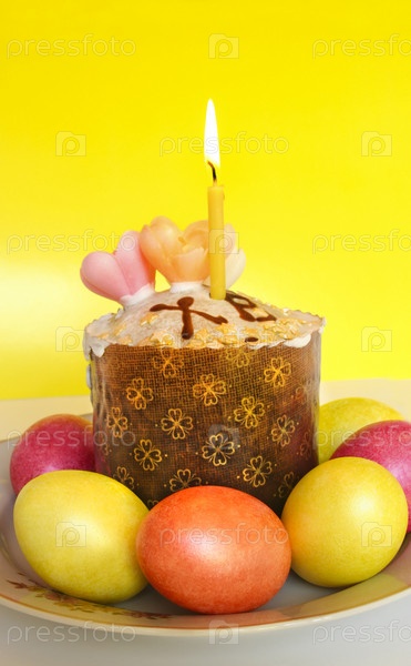 Пасхальный кулич с яйцами и свечкой на желтом фоне
