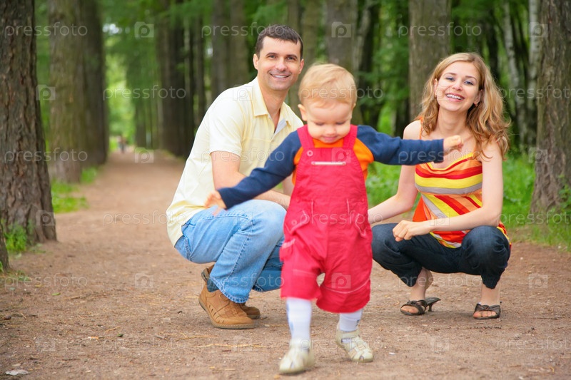 Ребенок с родителями в парке учится ходить