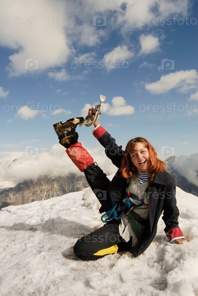 Рыжая девушка на вершине высокой горы с ледорубом в руках
