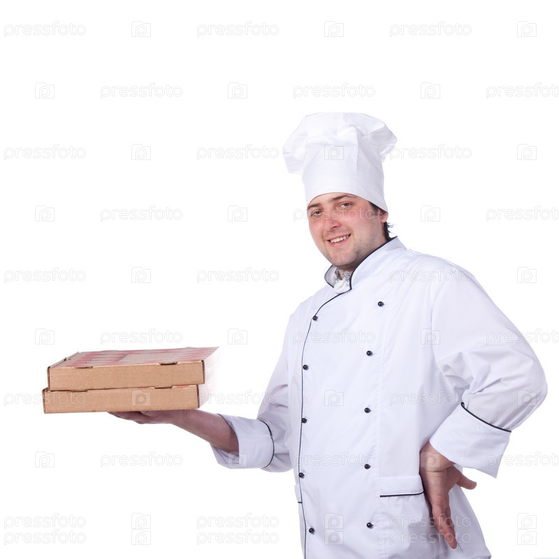 Мужской шеф-повар, держащий коробки с пиццей