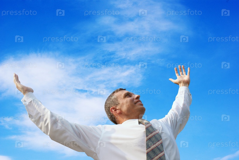 Успешный счастливый бизнесмен на фоне голубого неба