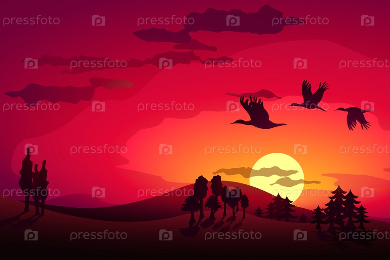 Полет аистов на закате солнца